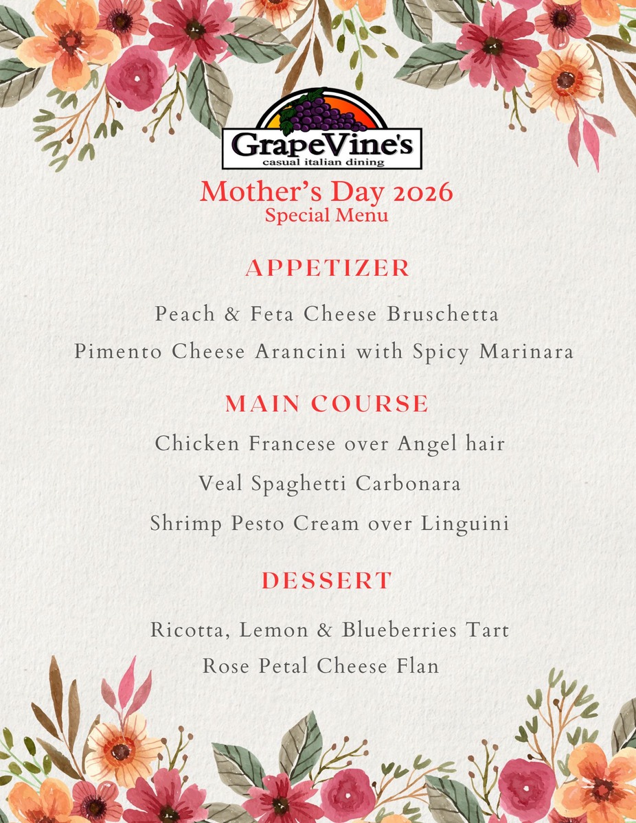 Join us on Mother's Day and treat your mom to a delicious meal! Chef Created Special Menu Available. Full menu